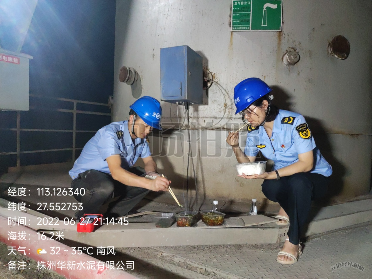 "千里之堤溃于蚁穴!千万不要小看了这些所谓的小问题!乱加一种药剂有可能造成整个设施运行不正常;忘关一个阀门有可能导致废水排放超标;少喷一次除臭剂有可能引发群众对恶臭排放的举报投诉。只有把这些细节规范起来,咱们企业的路才能走的更远。"来自株洲市生态环境局渌口分局的马泽华大队长冒着炎热酷暑,头顶烈日仍在某水泥生产企业高温挥发窑旁检查,期间在多个点位间认真排查,逐一核实问题,汗水浸透全身衣服仍不自知。检查完后耐心、仔细地逐一向某水泥生产企业反馈发现的问题。不知不觉间便错过了晚饭时间,他们像往常一样,为了节省时间,便简单点了个盒饭,现场解决晚餐的问题。一边吃饭,一边与队友交流的还是下一个点位需要重点关注哪些环节。