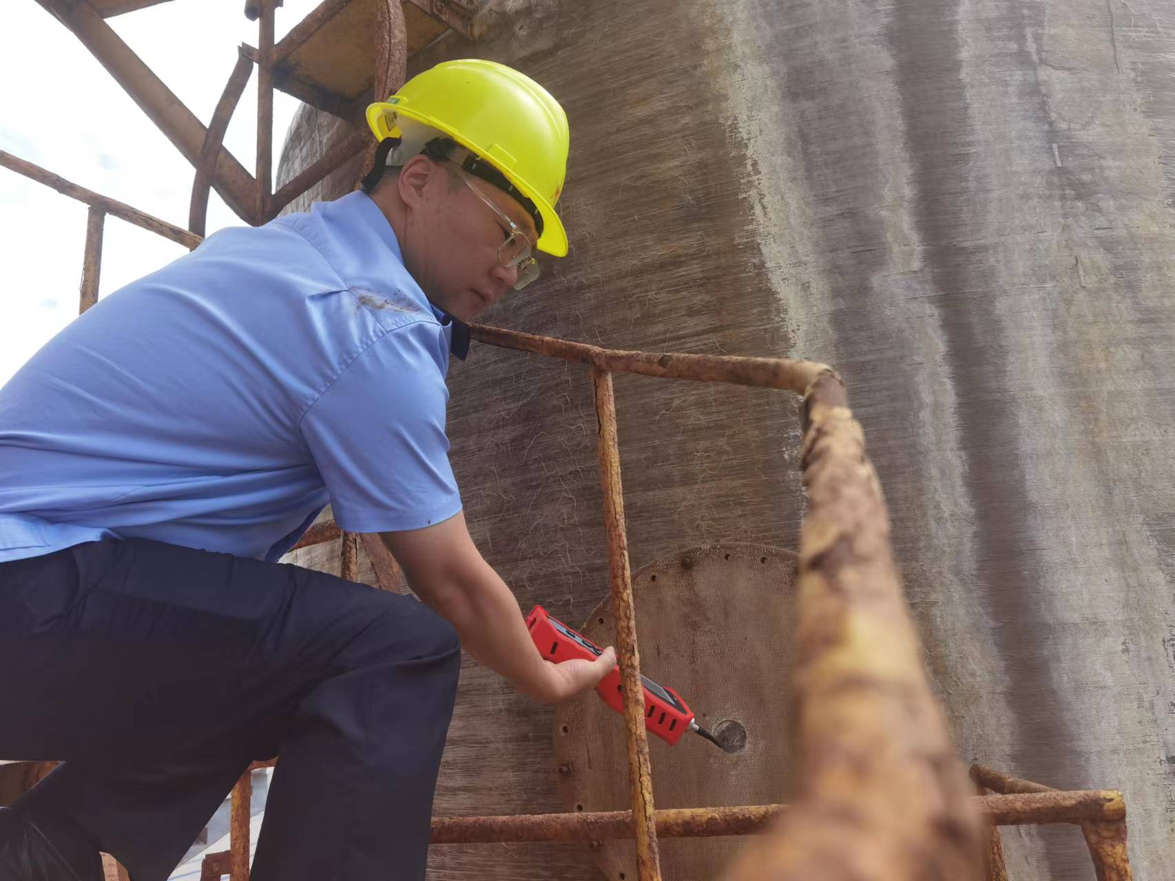 一家砖瓦厂大气排放情况如何,和脱硫塔的处理效果关联很大。"越是这种时候,我们越不能松懈,一轮又一轮的大气帮扶工作下来,我们变得更加熟练,工作也因此要更加细致。"石峰分局副大队长黄洋手持PID检测仪,他头戴安全帽,爬上高高的旋转梯,在现场认真细致的检查,在高温的脱硫塔旁,身后早已被汗水浸湿。