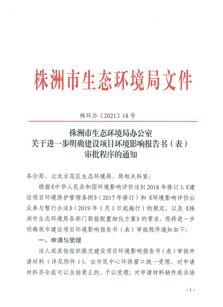 株洲市生态环境局办公室关于进一步明确建设项目环境影响报告书(表)审批程序的通知