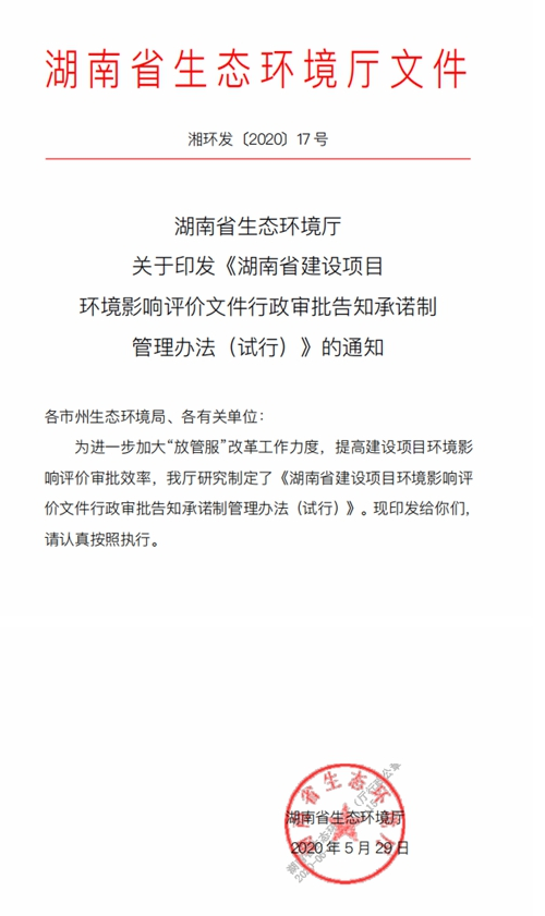 关于印发《湖南省建设项目环境影响评价文件行政审批告知承诺制管理办法(试行)》的通知