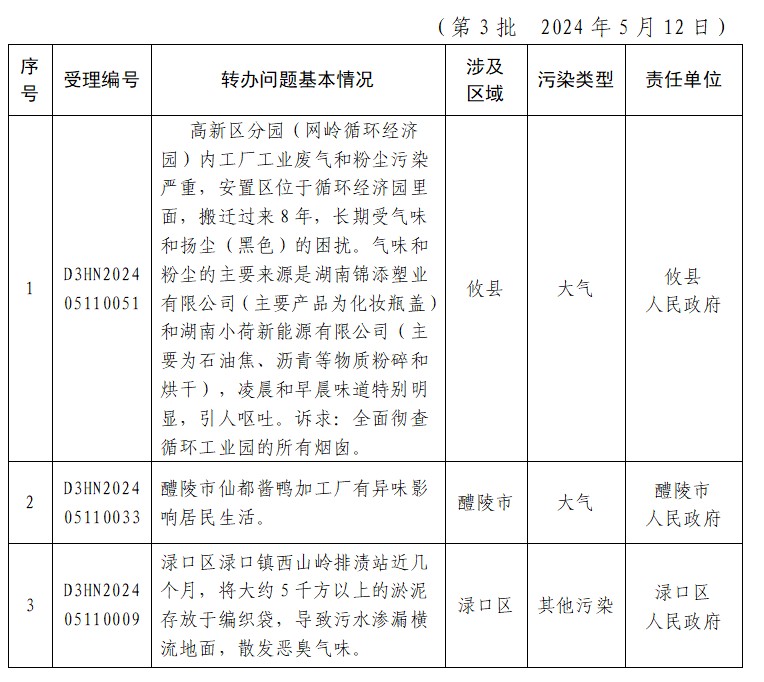 5月12日督察组交办第三批信访件81件,分解后交办85件,其中我市3件,长沙28件、岳阳9件、衡阳7件、娄底6件、常德5件,湘潭、永州、怀化、张家界各4件,邵阳、益阳、湘西州各3件,郴州市2件。