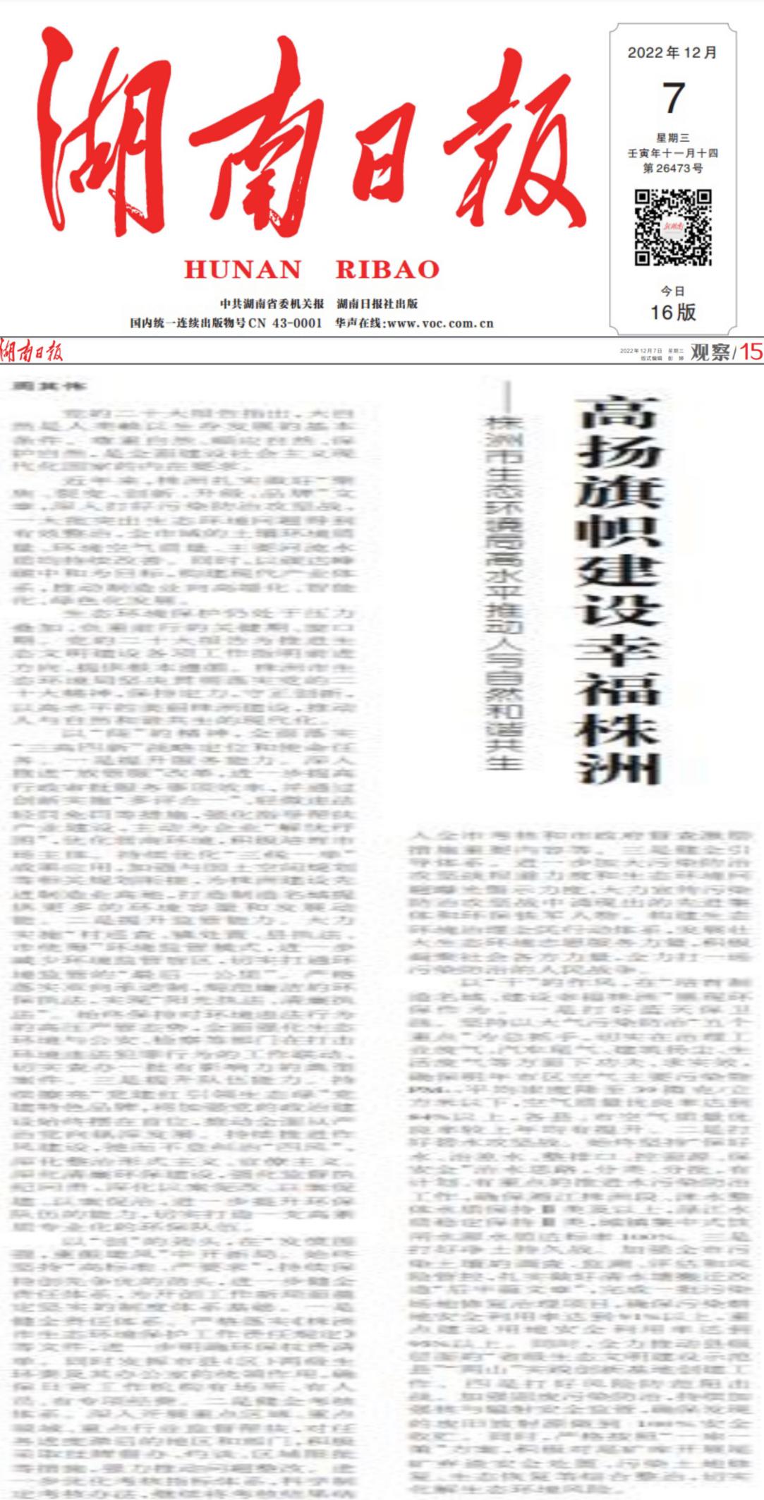 12月7日,株洲市生态环境局党组书记、局长周其伟在《湖南日报》发表一篇名为《高扬旗帜建设幸福株洲——株洲市生态环境局高水平推动人与自然和谐共生》的署名文章,下面,我们一起来了解下这篇署名文章。