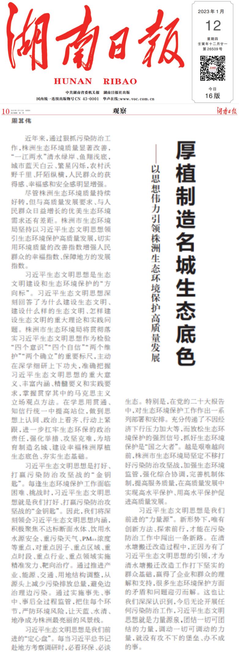 1月12日,株洲市生态环境局党组书记、局长周其伟在《湖南日报》发表一篇名为《厚植制造名城生态底色——以思想伟力引领株洲生态环境保护高质量发展》的署名文章,下面,我们一起来了解下这篇署名文章。