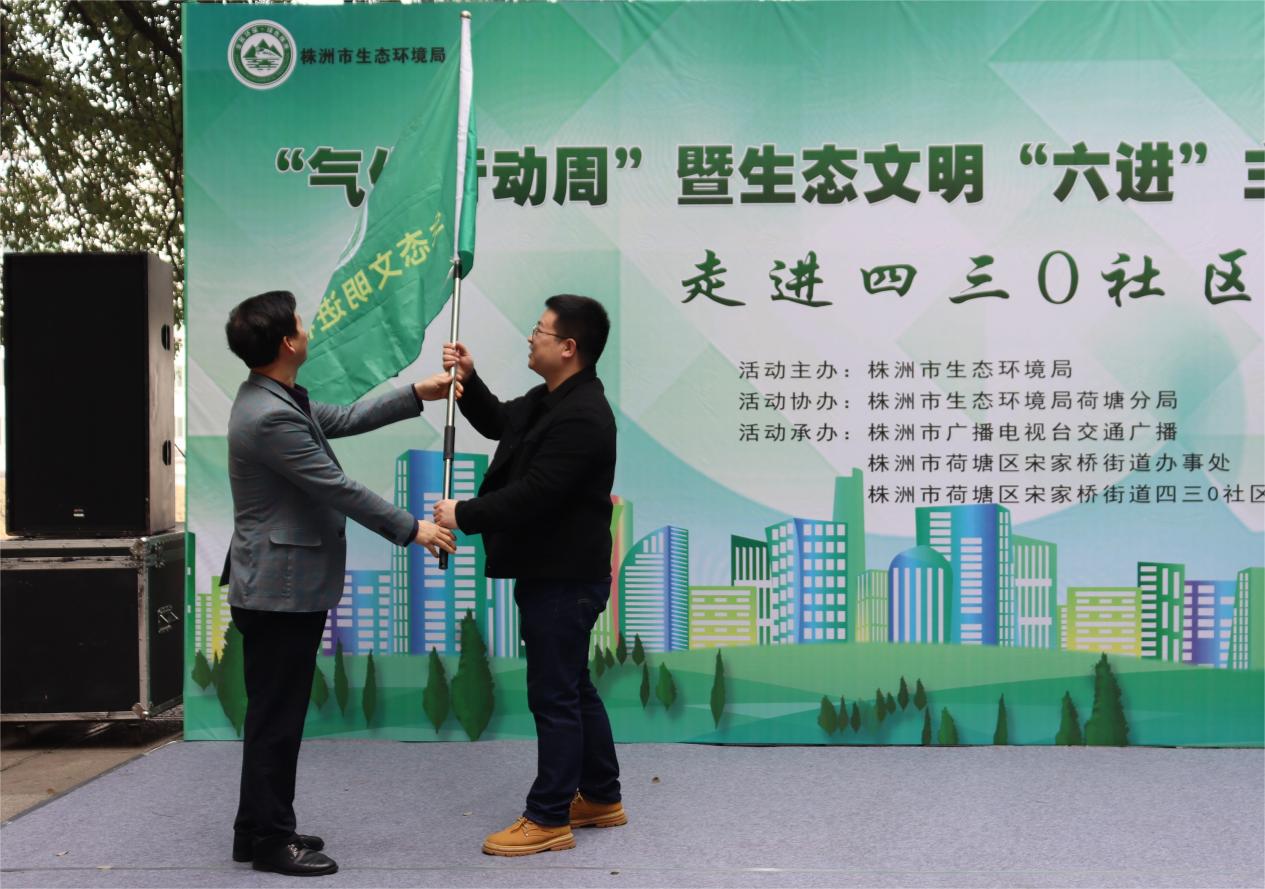 ▲市生态环境局荷塘分局局长授旗给宋家桥街道四三0社区
