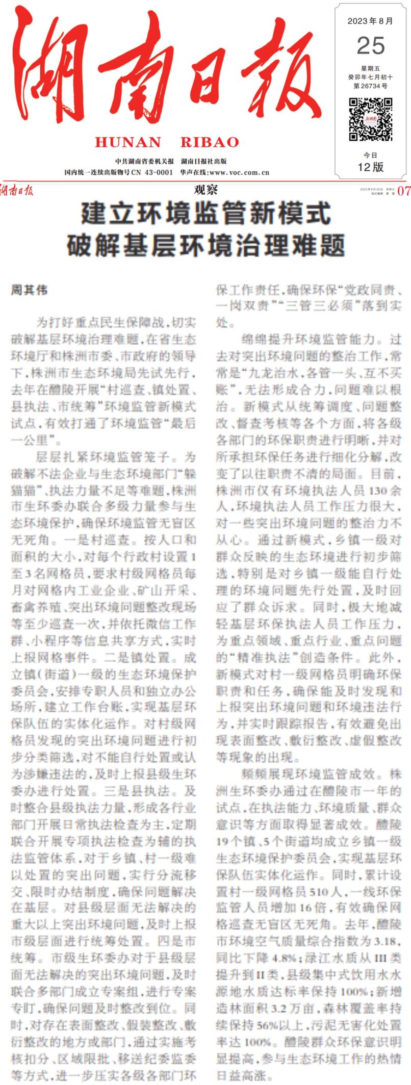8月25日,株洲市生态环境局党组书记、局长周其伟在《湖南日报》发表一篇名为《建立环境监管新模式 破解基层环境治理难题》的署名文章,下面,我们一起来了解下这篇署名文章。