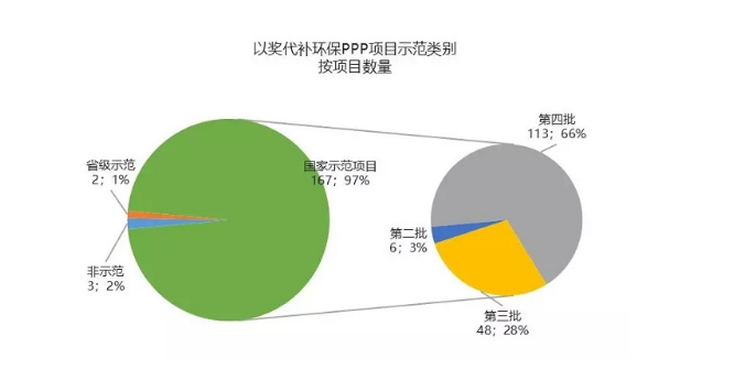 获得以奖代补资金的环保PPP项目大部分为示范项目,其中国家示范项目最多为167个,占比达97%,省级示范项目2个,仅3个项目为非示范项目。