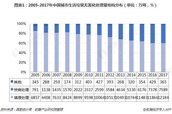 目前,中国生活垃圾无害化处理的方式主要有三种:卫生填埋、焚烧和其他。2005年,中国城市垃圾无害化处理量8051.1万吨中填埋量占比为85.17%,焚烧量占比为9.82%。据测算2017年中国城市生活垃圾无害化处理量20138.2万吨中卫生填埋量为12183.6万吨,占比约为60%;焚烧量为7589.3万吨,占比约为37.7%;其他无害化处理量占比仅为2.3%,说明目前中国城市生活垃圾处理还是以卫生填埋为主。