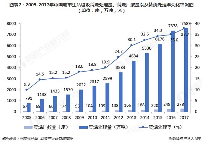 和传统的堆肥、填埋等处理方式相比,焚烧具有处理效率高、占地面积小、对环境影响相对较小等优点,更能满足城市生活垃圾处理对减量化和无害化的要求。并且焚烧处理的方式还能利用焚烧产生的热能,实现垃圾的资源化,这些优势使得垃圾焚烧处理在近些年逐渐得到了较为广泛的应用与推广。焚烧垃圾场的数量从2005年的67座增长到2017年的278座,焚烧垃圾处理量由2005年的791万吨增长到2017年的7589万吨。焚烧处理率由2005年的9.8%上升到2017年的37.7%。