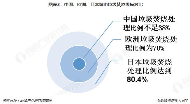 但从全球范围内的垃圾处理行业来看,中国垃圾无害化处理中采用焚烧方式处理的比例仍然较低,目前占比不足38%,而发达国家的处理能力普遍在65%以上,日本垃圾焚烧达到80.4%,欧洲超过70%。可以看出,目前中国在垃圾焚烧处理率上与国外发达国家相比还存在一定的差距。在城镇化率不断提高以及土地资源紧缺的当下,中国垃圾焚烧处理结构亟待调整。