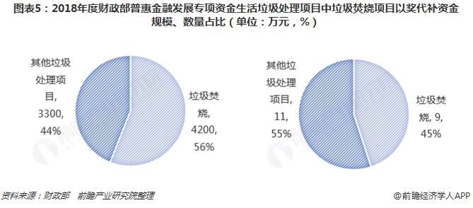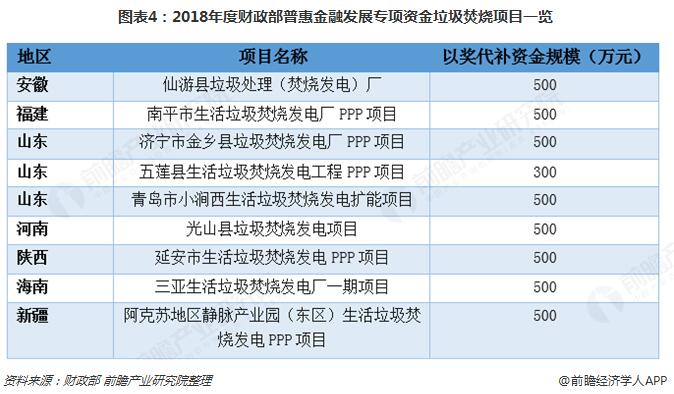 针对目前中国垃圾焚烧处理比例偏低的情况,财政部通过以奖代补的方式积极推动垃圾焚烧处理项目的发展,在《关于下达2018年度普惠金融发展专项资金预算的通知》涉及的20个生活垃圾处理的项目中,垃圾焚烧项目达到了9个。以奖代补的资金规模占到全部生活垃圾处理项目的56%。垃圾焚烧项目所涉及地区即包含东部沿海经济发达省份,又有西北、中部等内陆省份。