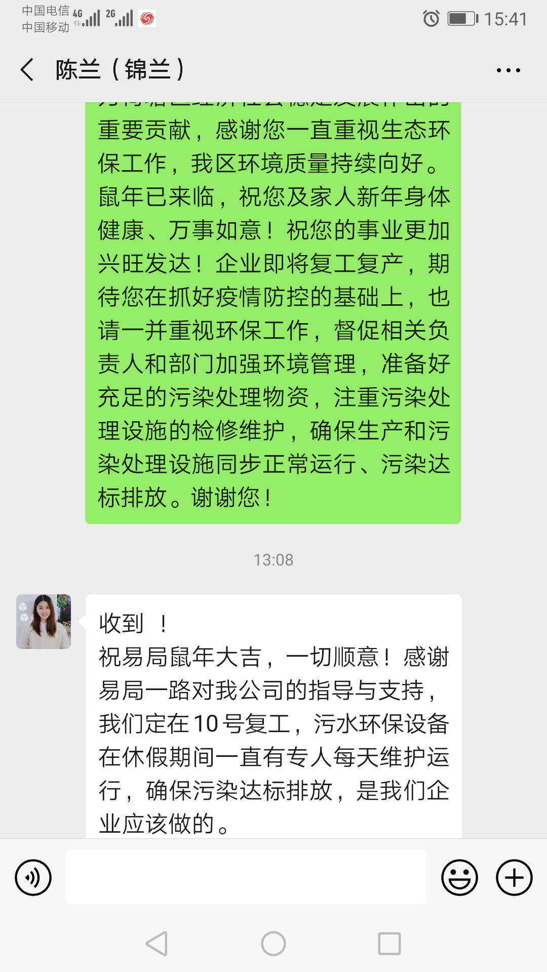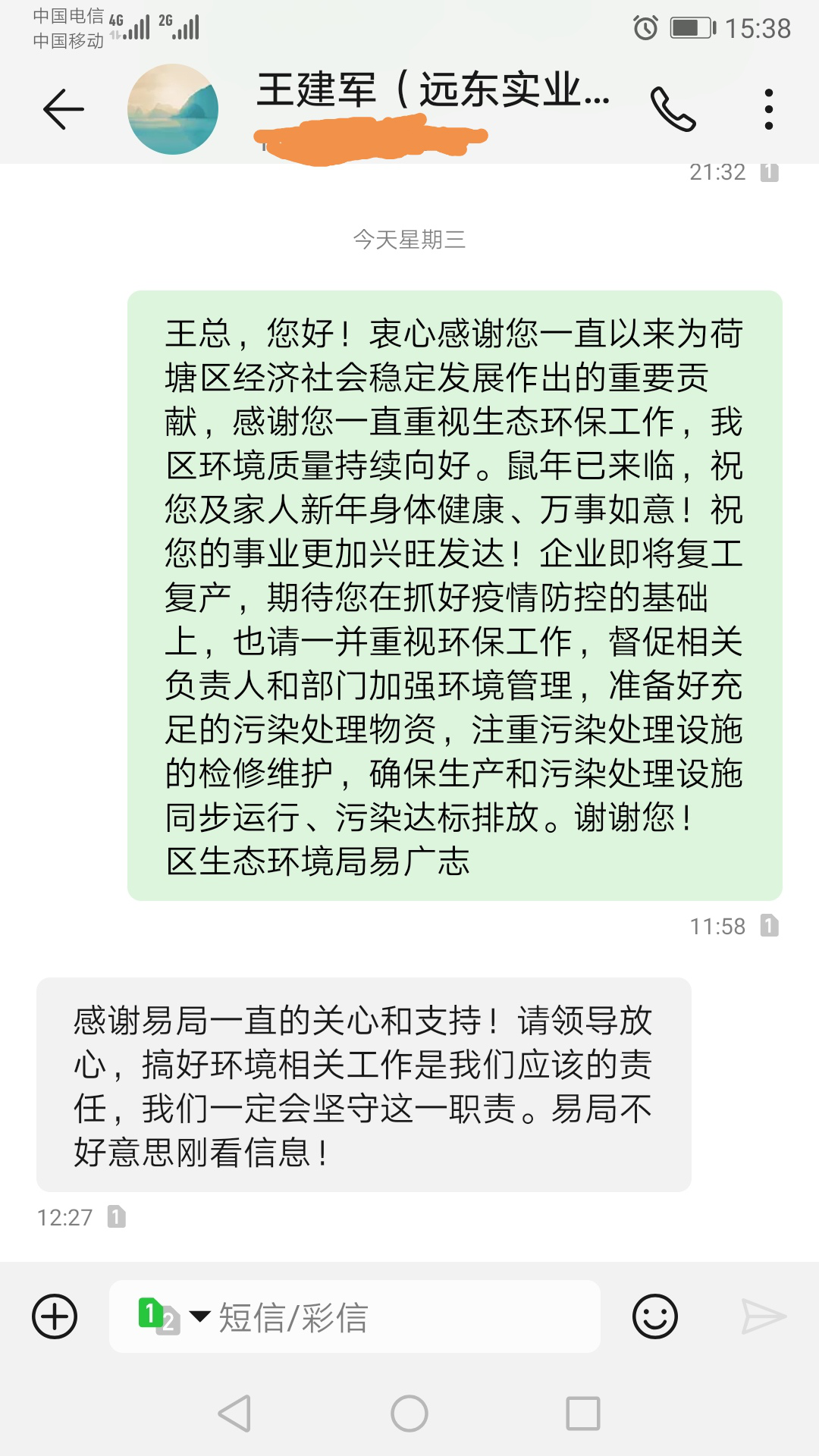 信息首先感谢企业主要负责人一直以来为荷塘区经济社会发展稳定作出的重要贡献,感谢一直重视生态环保工作,并为他们和他们的家人送上了新年祝福。然后,提示他们在抓好疫情防控的基础上,也要一并重视环保工作,督促相关负责人和部门加强环境管理,准备好充足的污染处理物资,注重污染处理设施的检修维护,确保生产和污染处理设施同步正常运行、污染达标排放,强化扬尘污染控制。
