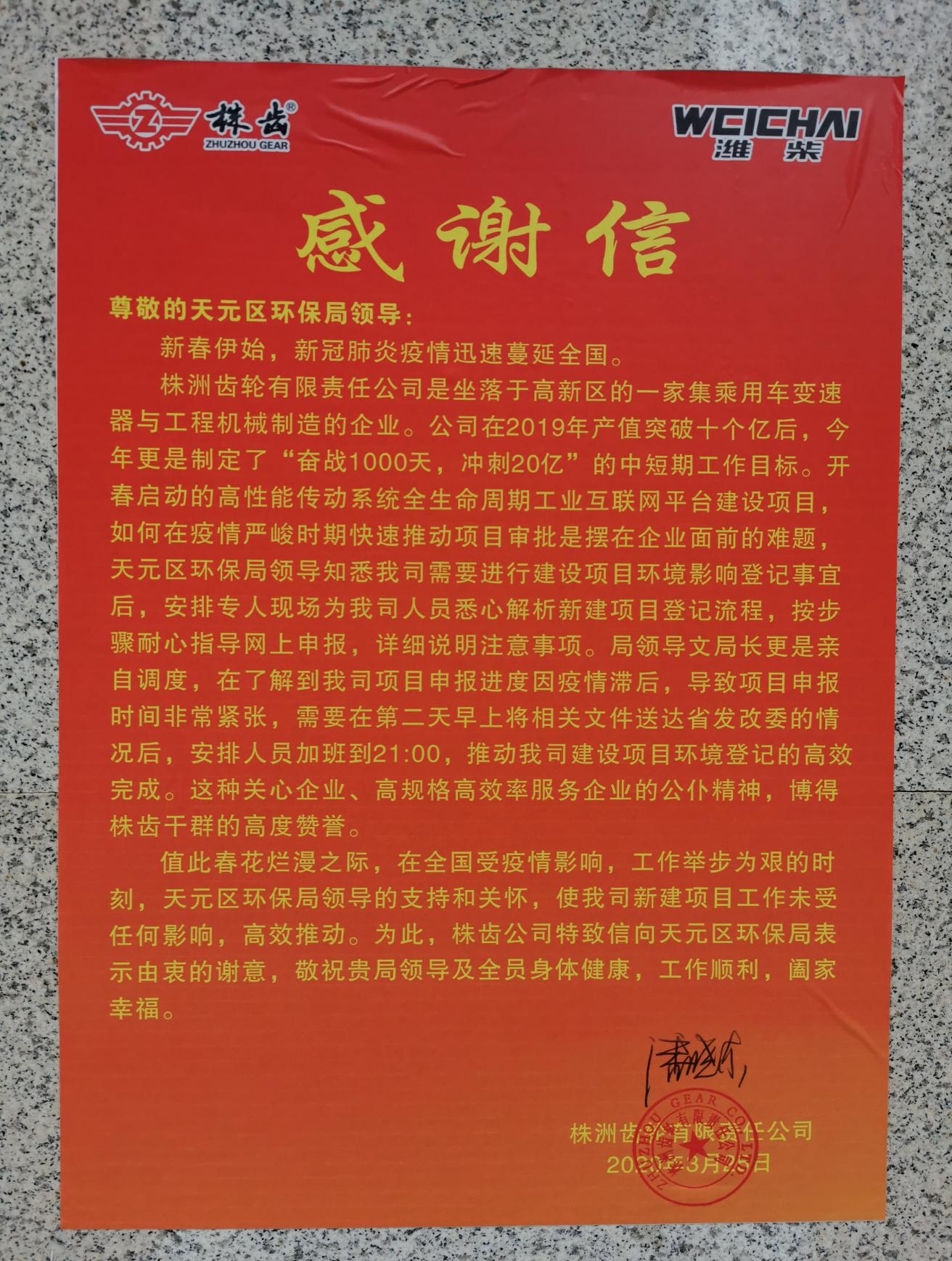 4月2日,株洲市生态环境局天元分局收到株洲齿轮有限责任公司写来的感谢信,对该局在复工复产"绿色通道"中快速审批相关环评文件,服务企业全面通过项目立项、融资审批表示感谢。