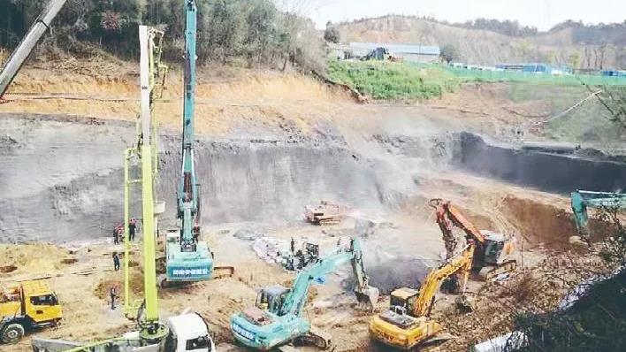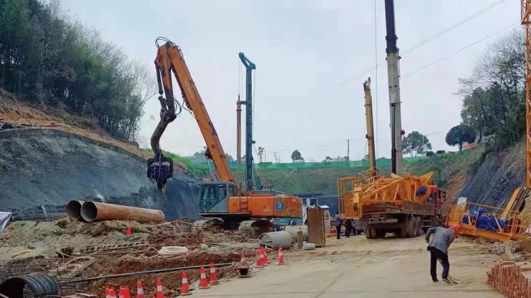 2月18日,上班的第一天,荷塘区桐梓坪村的南郊垃圾填埋场渗沥液处理站扩容改造项目现场,一派热火朝天的施工景象:工人们正忙碌地操作着旋挖机、挖掘机、振动锤、混凝土输送泵等一众施工设备,加班加点地进行桩基础施工。