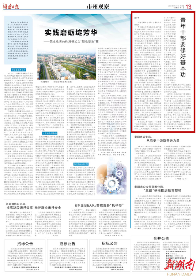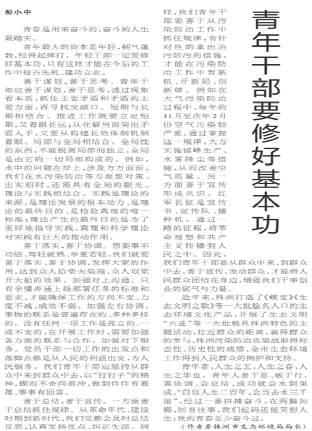 4月29日,株洲市生态环境局党组书记、局长彭小中就即将到来的"五四"青年节,在湖南日报发表一篇名为《青年干部要修好基本功》的署名文章。此文,根据彭小中同志在2021年株洲市生态环境系统青年干部大会上讲话,整理而来。下面,我们来了解一下这篇署名文章。