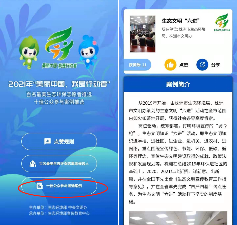 株洲生态文明"六进"活动成功入选中央文明办、国家生态环境部十佳案例候选,请广大网友为株洲生态文明"六进"活动投上宝贵一票!(点赞时间截至2021年5月11日24时结束。)