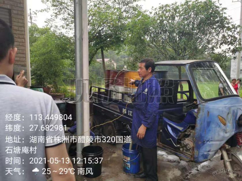 5月13日,五中队执法人员巡查至醴陵市国瓷街道古城村时,发现某摩托修理店门口停放一台无牌农用三轮车,三轮车驾驶员正通过电动泵往车上抽送黑色油状液体,疑似车辆维修过程中产生的废发动机油。执法人员迅速行动,展开现场调查。