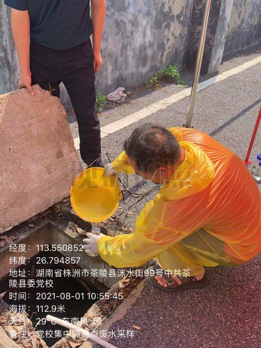 按照上级统一部署,为加强医疗废水收集处置监管。严格落实《新型冠状病毒污染的医疗污水应急处理技术方案(试行)》,确保各相关单位在疫情期间废水处理达标排放,8月1日株洲市茶陵生态环境监测站对我县两个集中隔离点(县委党校、平水卫生院)的医疗废水和茶陵首创污水处理有限责任公司总排口废水进行采样,监测人员冲锋在一线,战斗在前沿,严格按照检测技术规范进行现场采样及样品保存并第一时间送至实验室进行分析,确保监测数据及时准确,为疫情期间环境监管提供科学依据。