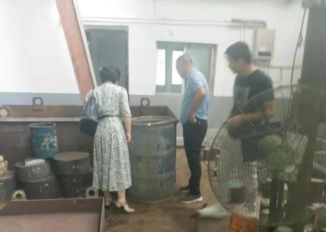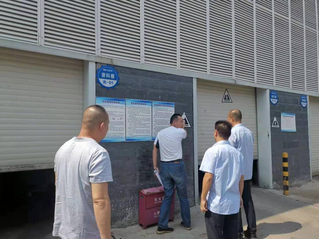 ▲荷塘分局生态环境工作人员对辖区内重点企业危废现场进行检查