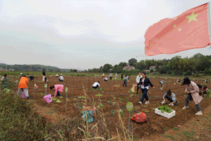 活动当天,干部职工们"各奔东西",挖土的挥一挥锄头汗流浃背,种植的挖坑、放苗、填土一气呵成,担水、浇水的健步如飞,经过两个小时的奋战,原来光溜溜的土地瞬间变得绿意盈盈。