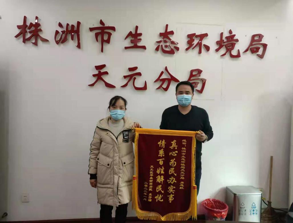 2022年1月12日下午,天元区华晨御园居民袁芳女士将一面写有"真心为民办实事,情系百姓解民忧"感谢株洲市生态环境局天元分局易忠红的锦旗送到市生态环境局天元分局文红武局长的手中,随后,会议室响起一阵热烈的掌声。