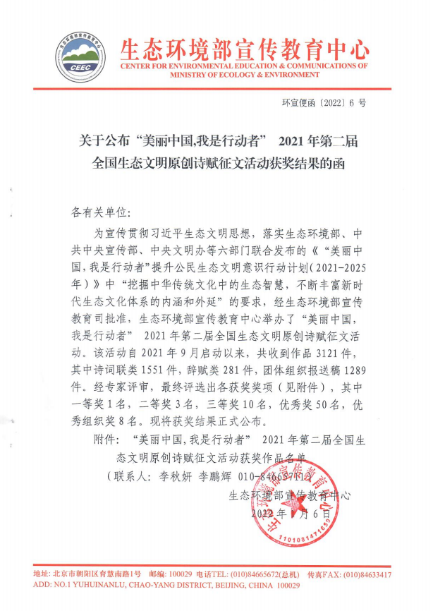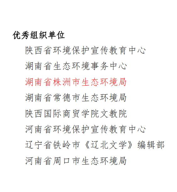 日前,在国家生态环境部宣传教育中心主办的2021年第二届全国生态文明原创诗赋征文活动中,株洲市生态环境局荣获优秀组织单位,全国仅8个。