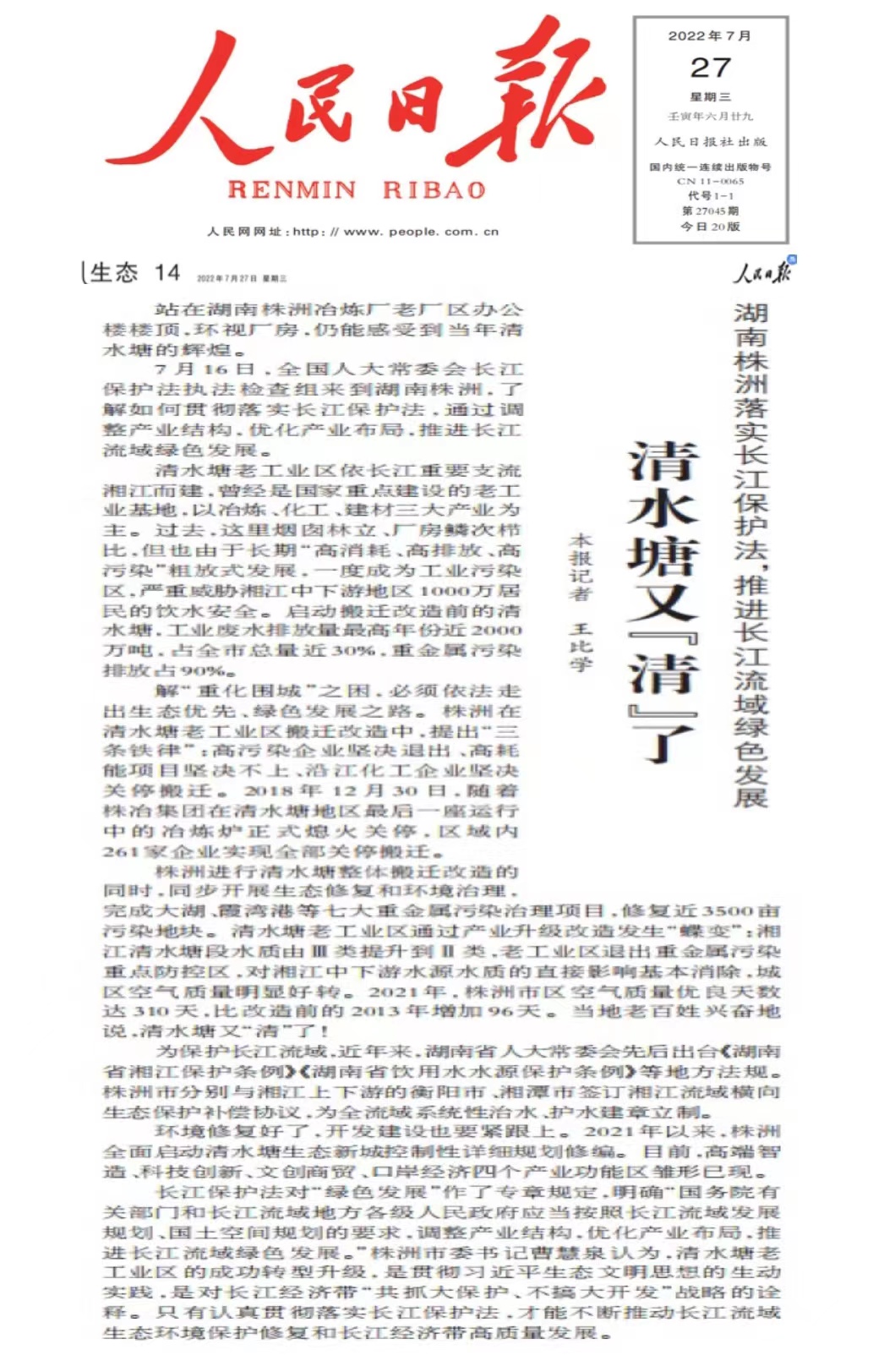 7月27日,《人民日报》专题报道了我市在清水塘生态环境工作上所取得的成效,下面,我们一起来了解下。