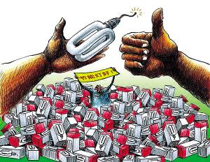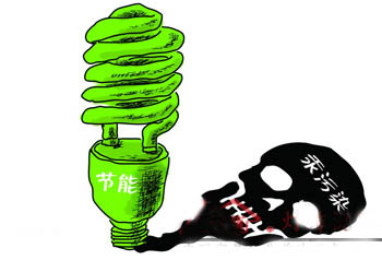 废旧节能灯具的排放。据研究资料显示,一支管径36mm荧光灯管含汞量为25-45mg,一支管径10mm的节能灯泡含汞量为10-15mg,一支高压钠灯含汞量为1214mg,一支金卤灯含汞量为20-25mg。近几年,我国每年生产加工灯管消耗汞达80t之多,每年释放出汞及化合物量数以百吨计,严重污染土壤和水源进而危害人体健康。