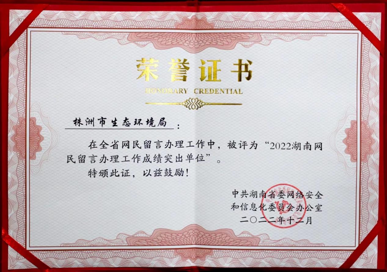 2月3日,由湖南省委网信办指导,湖南红网新媒体集团主办召开了"听民声 聚民心——2022湖南网上群众工作创新论坛"。论坛上,株洲市生态环境局获评"全省网民留言办理工作成绩突出单位"。