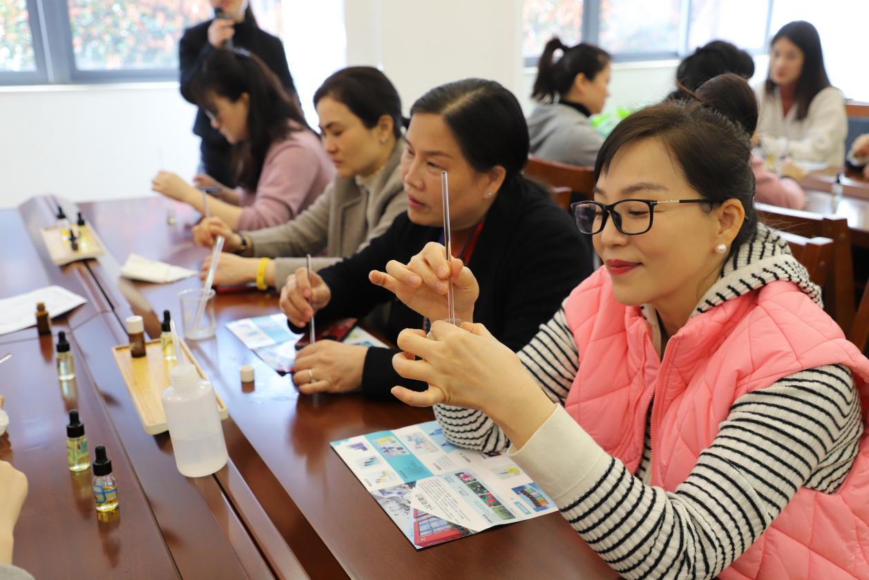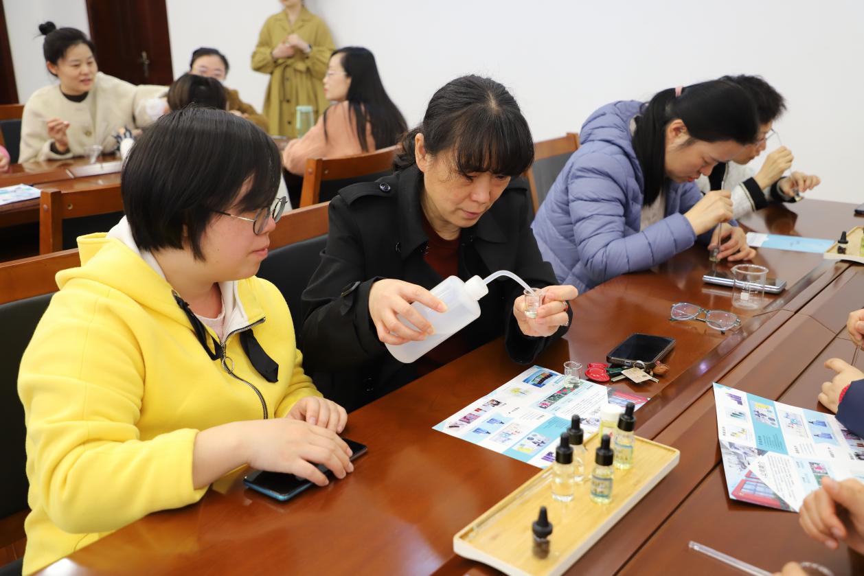 在活动现场,调香师讲授了香水的结构、种类、涂抹方式以及调香知识和实际操作步骤,并在现场示范了操作流程,女同胞们在调香师的指导下结合专业知识,精准地计算着每一种香精油的配比,个个踊跃参与互相协作,现场气氛热烈,妙趣横生,在一片欢声笑语中有条不紊地进行着每一步操作,整个活动现场都弥漫着温馨甜美的味道。