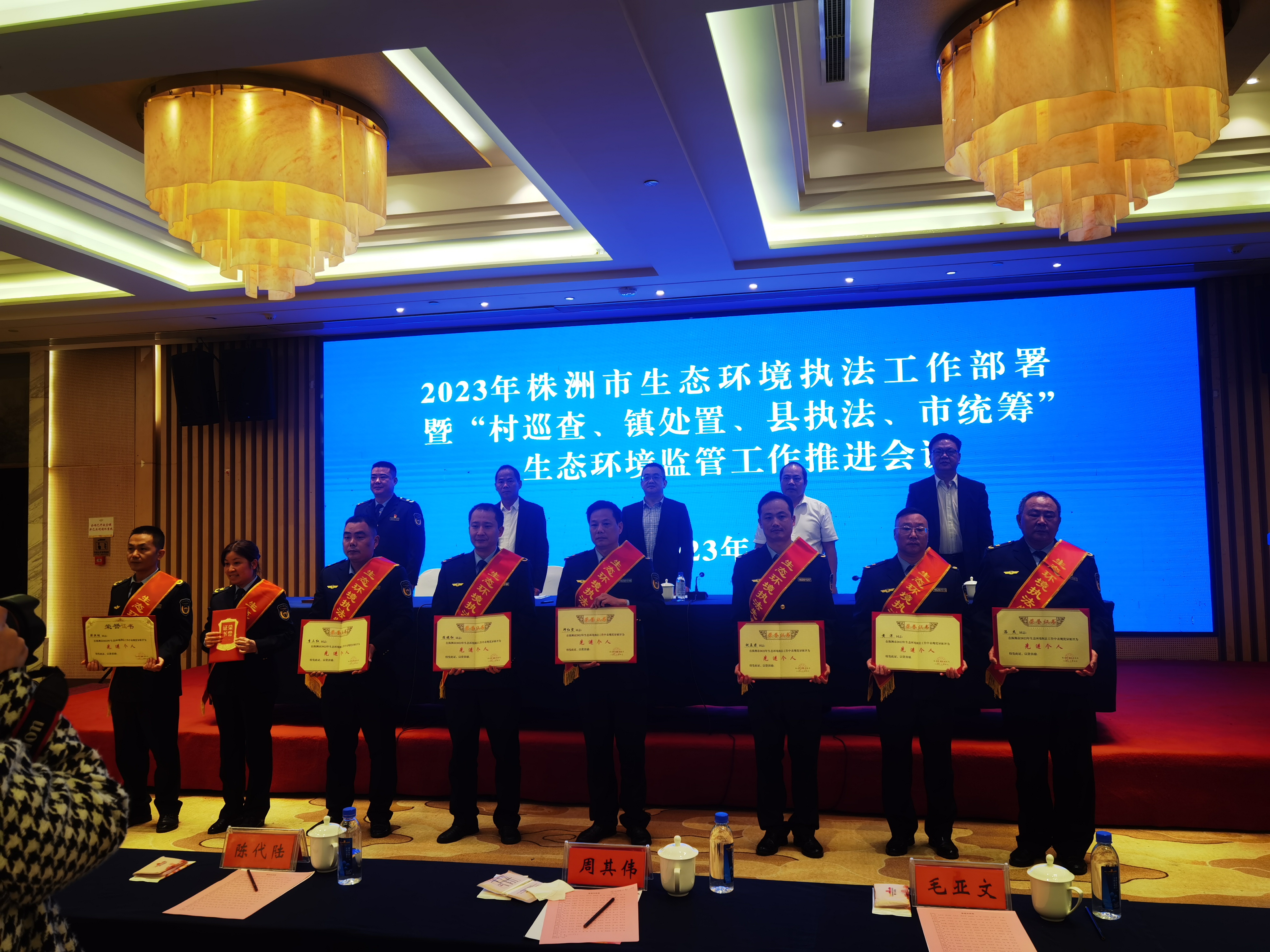 4月27日,2023年株洲市生态环境执法工作总结部署暨"村巡查、镇处置、县执法、市统筹"生态环境监管工作推进会议在醴陵召开。会议对2022年度全市执法工作先进集体和先进个人表彰通报,并向先进颁奖。相关分局作了表态发言和经验交流发言。我分局分别获得了生态环境执法工作先进单位和综治信访投诉工作先进单位,并有2名同志获得了执法先进个人和"利剑"行动先进个人。