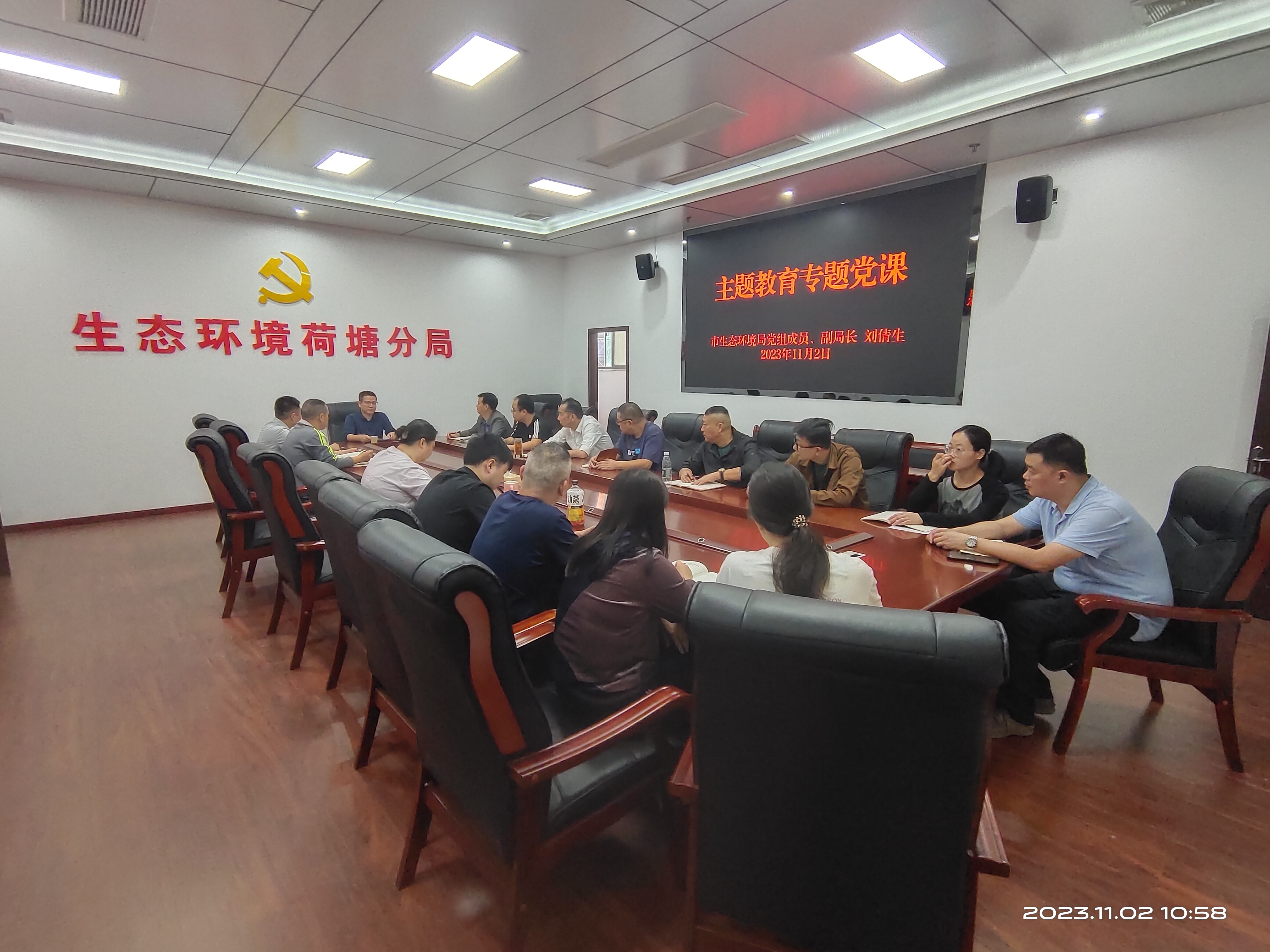 2023年11月2日上午,株洲市生态环境局党组成员、副局长刘倩生到荷塘分局给全体党员进行主题教育专题党课辅导。