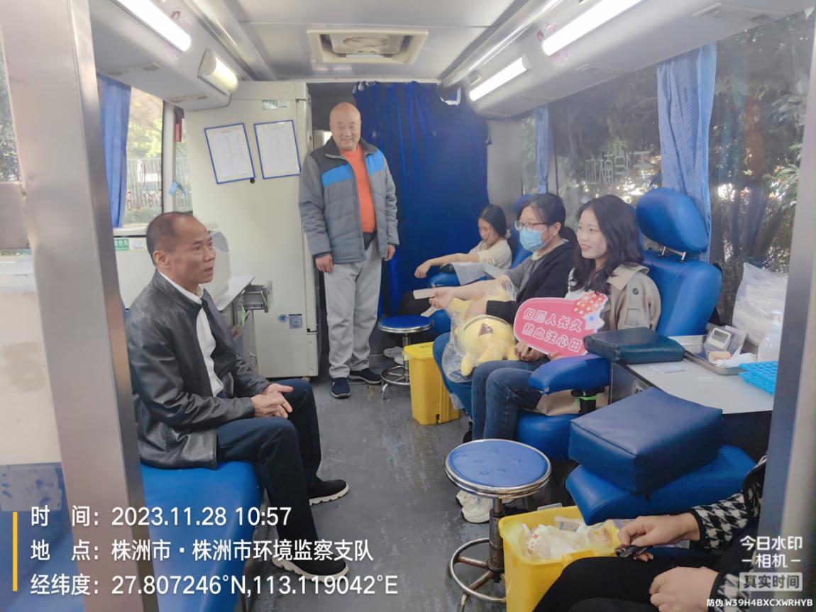 2023年11月28日,株洲市生态环境局在局前坪开展集中无偿献血活动,全局报名参加献血人员达30人,成功献血19人,献血量6800毫升。局党组副书记、副局长毛亚文慰问了无偿献血人员。
