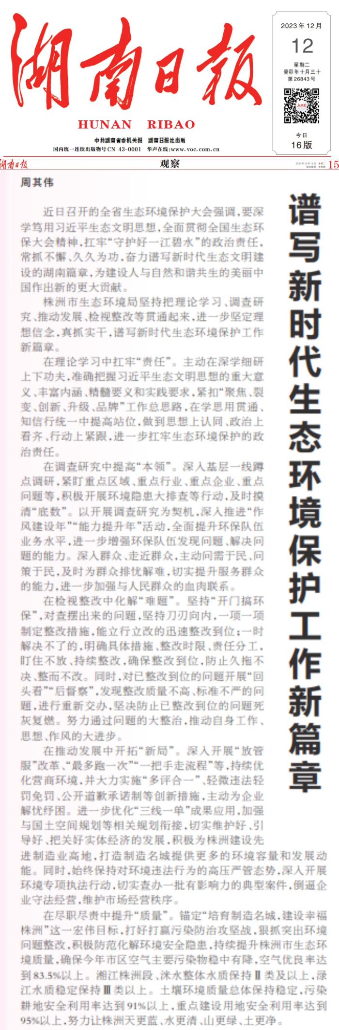 12月12日,株洲市生态环境局党组书记、局长周其伟在《湖南日报》发表一篇名为《谱写新时代生态环境保护工作新篇章》的署名文章,下面,我们一起来了解下这篇署名文章。