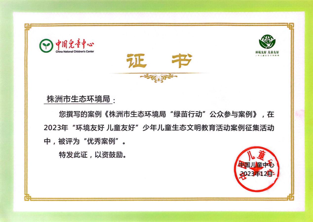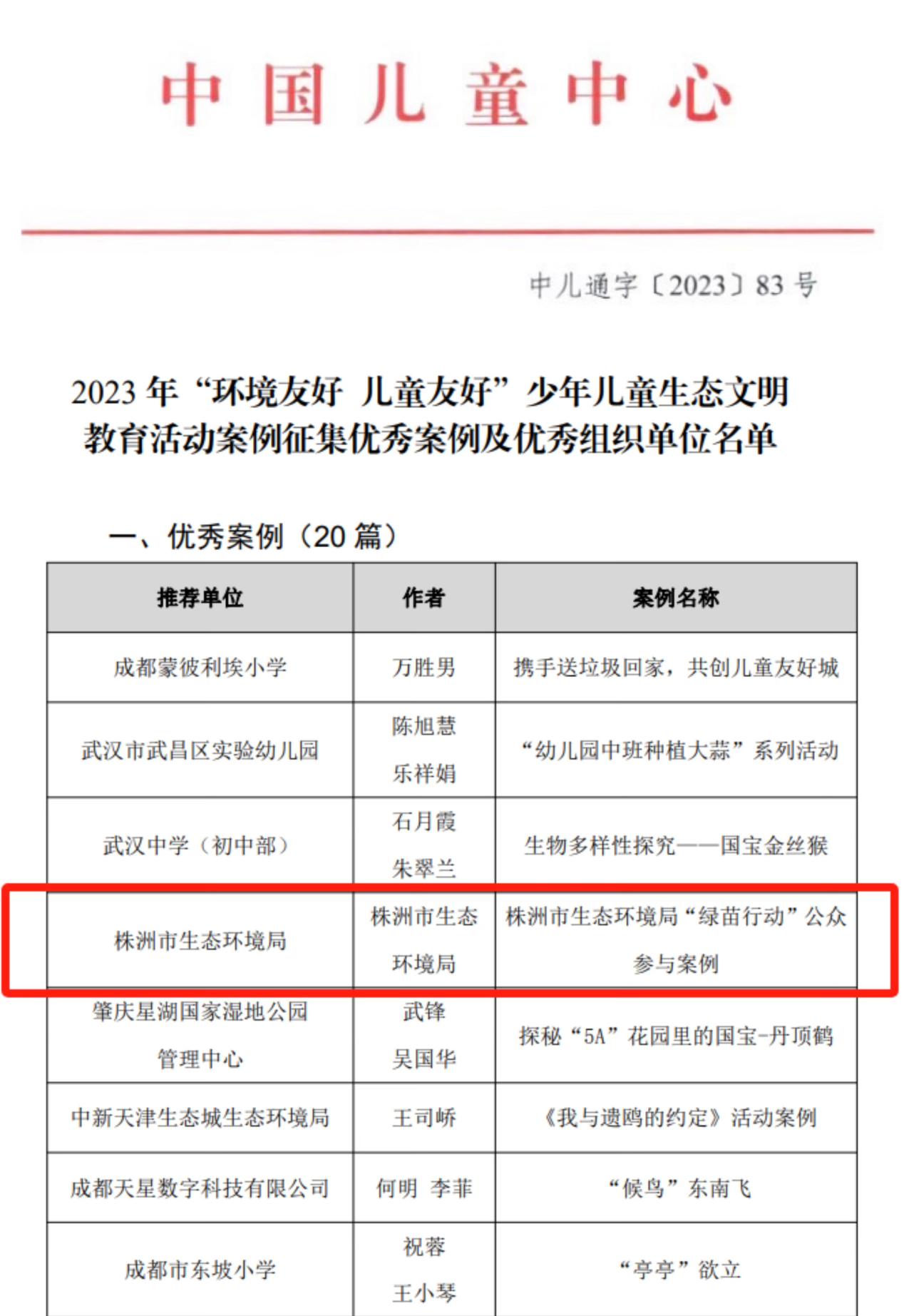 近日,株洲市"绿苗行动"在2023年"环境友好 儿童友好"少年儿童生态文明教育活动案例征集活动中被评"优秀案例"(全国仅20个,全省唯一)。