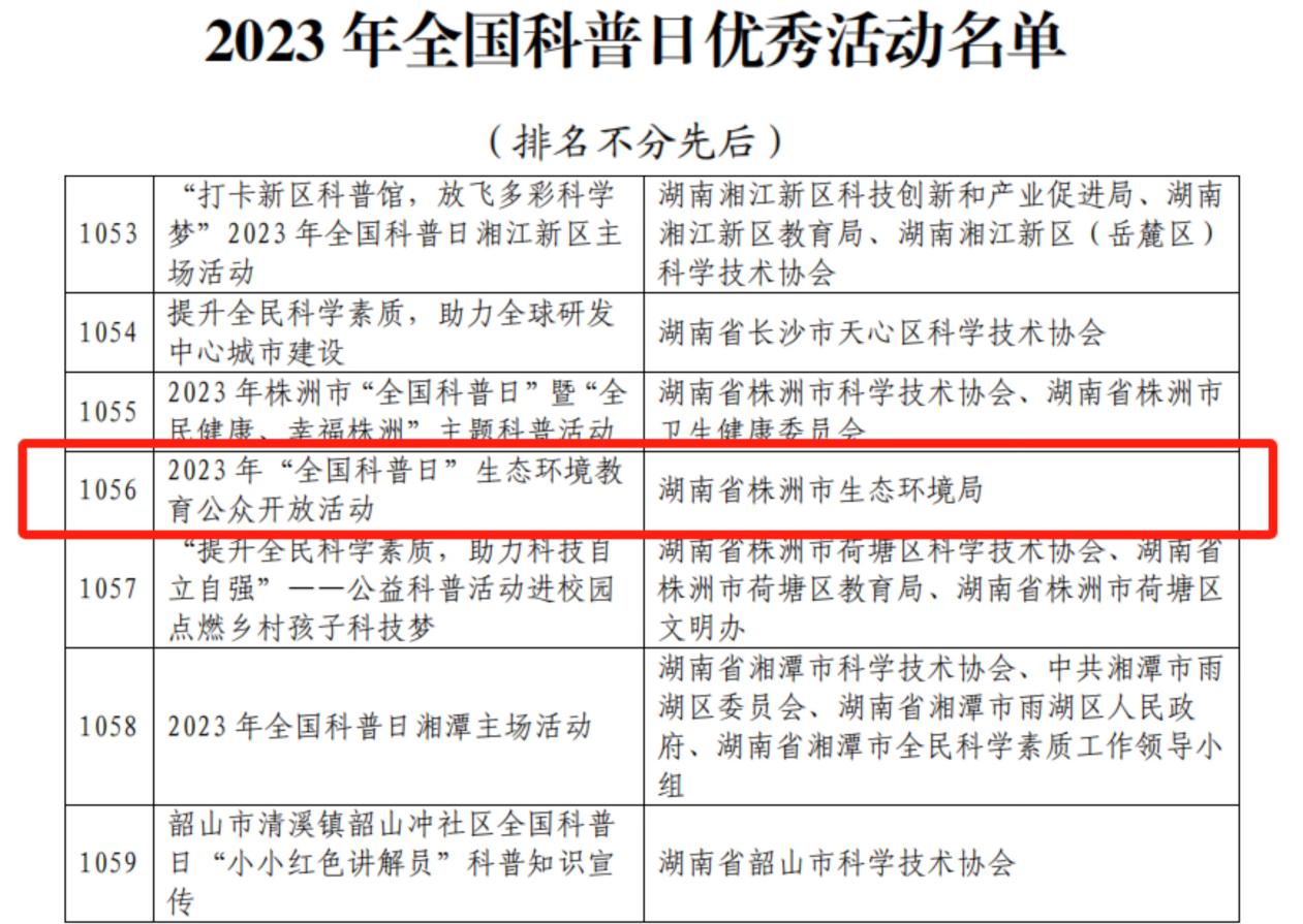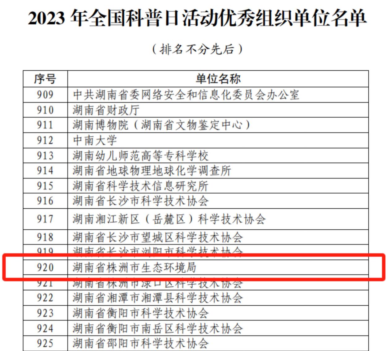 近期,2023年全国科普日优秀活动和优秀组织单位名单公布。其中,株洲市2023年"全国科普日"生态环境教育公众开放活动获评"优秀活动",株洲市生态环境局获评"优秀组织单位"。