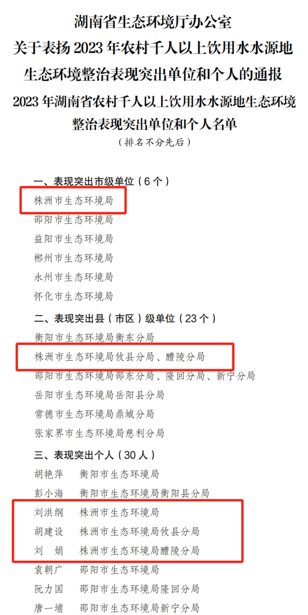 近日,湖南省生态环境厅印发《关于表扬2023年农村千人以上饮用水水源地生态环境整治表现突出单位和个人的通报》。其中,株洲市生态环境局被评"表现突出市级单位",株洲市生态环境局攸县分局、醴陵分局被评"表现突出县(市区)级单位",刘洪纲、胡建设、刘娟等人被评"表现突出个人"。