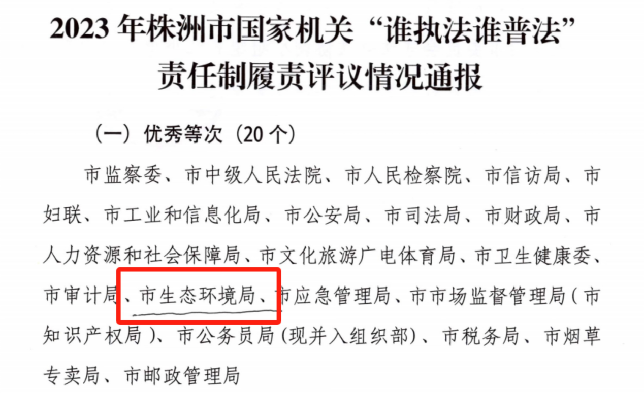 近期,株洲市守法普法工作办公室印发《2023年株洲市国家机关"谁执法谁普法"责任制履责评议情况通报》。其中,株洲市生态环境局被评"优秀等次"。