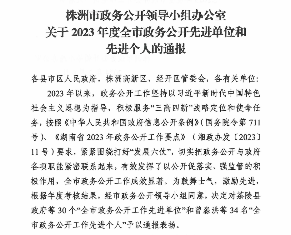 近日,株洲市印发了关于2023年度全市政务公开工作的通报,市生态环境局因工作表现优异被评"先进单位"。