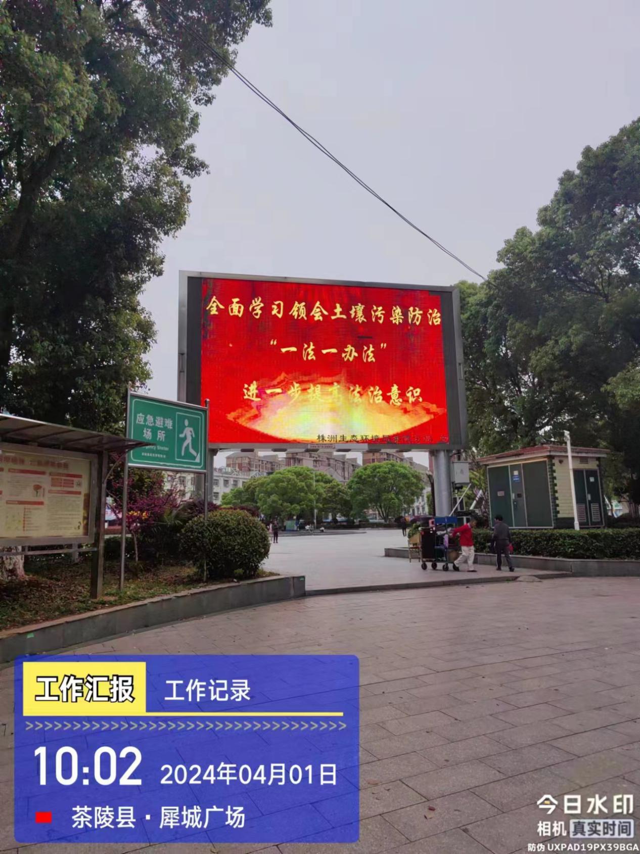 近日,在茶陵县犀城广场、居然之家广场等人流量、车流量高度集中地点的户外显示屏上,"全面学习领会土壤污染防治‘一法一办法’坚决扛牢土壤污染防治的政治责任""‘两山’理论新实践 纯净茶陵好生态""‘天蓝、水清、土净、地绿、低碳’和谐宜居的大美茶陵需要我们大家的共同努力"等内容丰富、通俗易懂的环保宣传标语循环播放,时刻提醒着人们要保护好生态环境。