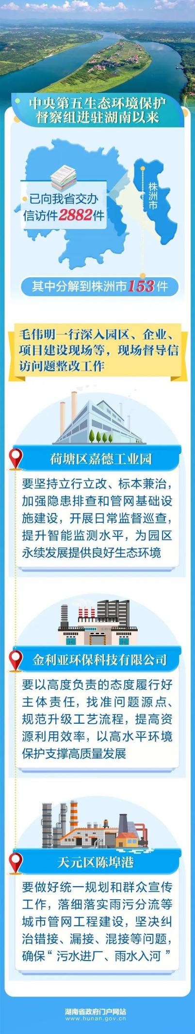 中央第五生态环境保护督察组进驻湖南以来,已向我省交办信访件2882件,其中分解到株洲市153件。毛伟明一行深入园区、企业、项目建设现场等,现场督导信访问题整改工作。