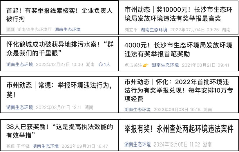 为鼓励公众积极参与生态环境监督管理,致力形成打击生态环境违法犯罪合力,构建生态环境保护社会共治大格局,湖南省生态环境厅和14个市州生态环境局畅通了"举报奖励"渠道。近年来,各级生态环境部门向公众兑现了举报奖励,形成了"共管、共治、共赢"的生态环境保护良好局面。