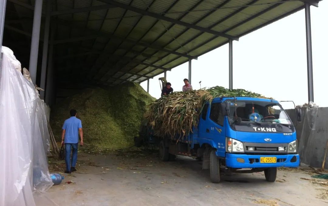 收集新鲜玉米、毛豆等秸秆,将其填入密闭的青贮窖内或打捆青贮包膜,达到长期保存其青绿多汁营养成分的目的,为草食动物提供优质青贮饲料。