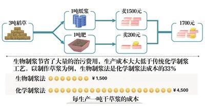 王宏算了笔经济账:3吨稻草出1吨纸浆和1吨肥;1吨纸浆卖1500元,1吨肥卖200元;3吨稻草能产生1700元的效益。同时,生物制浆节省了大量的治污费用,生产成本大大低于传统化学制浆工艺。以制作草浆为例,生物制浆法每生产一吨干草浆的成本仅为1500元,是化学制浆法每吨的4500元的33%。