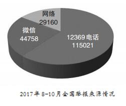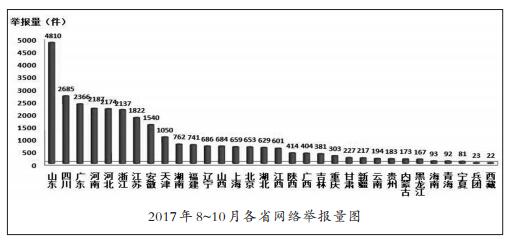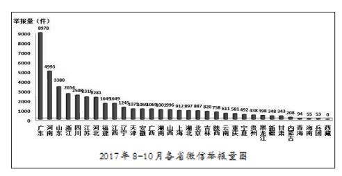 2017年8~10月,公众使用微信举报最频繁的是广东、河南两省,举报数量合计占全国总数的31.2%。