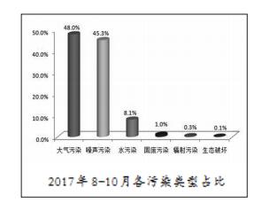 2017年8~10月全国各类举报中,涉及大气污染的举报最多,占48%,其次为涉及噪声、水、固废的污染举报,分别占45.3%、8.1%、1%,举报量相对较少的为辐射污染和生态破坏,分别占0.3%和0.1%。
