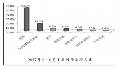 从全国举报情况来看,公众反映最集中的行业是建筑业,占52.9%,其次是住宿/餐饮/娱乐业和化工业,分别占17.2%和6.5%。8~10月举报次数较多的企业有江西省南昌市麦园垃圾填埋场、宁夏回族自治区银川市启元药业、广东省广州市云埔工业区、深圳市红花岭垃圾填埋场、下坪垃圾填埋场等。