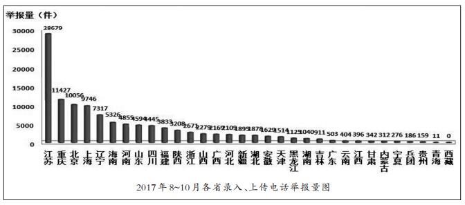 2017年8~10月,各地按照环境保护部环保举报联网工作要求,将本地受理的“12369”环保举报热线电话信息录入或上传到全国举报联网平台,其中数据录入或上传数量比较完整的省(直辖市)有:江苏、重庆、北京、上海、辽宁、海南等,城市有:南京、苏州、沈阳、太原、成都、济南、厦门等。