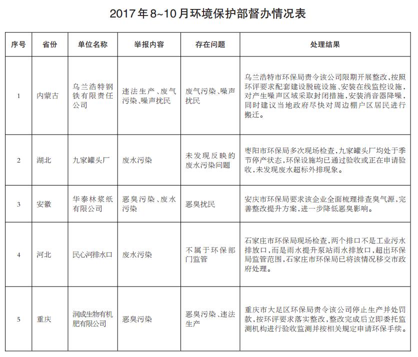 环境保护部通过全国环保举报联网平台对各地举报办理情况进行监督,对媒体、公众集中关注或处理不到位的举报高度重视,督促地方查清事实,依法实施处理处罚(8~10月共11件督办情况见2017年8~10月环境保护部督办情况表)。