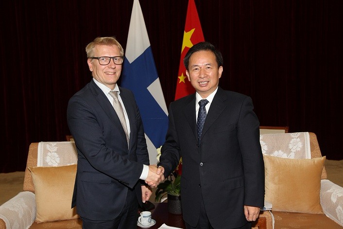 生态环境部部长李干杰日在京会见了芬兰环境、能源与住房部部长凯莫·蒂卡宁先生,双方就建立“一带一路”绿色发展国际联盟、应对气候变化及深化中芬环保合作等议题进行了深入交流。