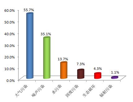 大气污染举报中,反映恶臭/异味污染的举报最多,占涉气举报的46.7%,其次为烟粉尘及工业废气的举报,分别占涉气举报的31%和20.8%。噪声污染举报中,反映建设施工噪声污染的举报最多,占噪声举报的39.9%,其次为反映工业噪声的举报,占33.7%。水污染方面,反映工业废水污染的举报最多,占涉水举报的56.7%。